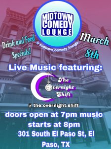 El Paso, TXExperience Live Comedy Funupcoming Events DiscoverThe Ultimate Comedy Night ExperienceJoin us at Midtown Comedy Lounge for a night filled with laughter, drinks, food, and unforgettable performances by top-notch comedians in a vibrant and intimate atmosphere. meet the team Upcoming EventsFeatured Comedians and Performers Tommy Black BASH & Comedy JamSaturday March 1, 2025 8 pm Doors open @7pm Tickets / Info The Overnight Shift Live MusicDrinks & Food SpecialsSaturday March 8, 2025 8 pm Doors open @7pm Tickets / Info Open Mic Showcase –2nd Thursday of Every Month March 13, 2025 contact us Ticket Info / List of Events Secure Your SeatGet Ticket Passes to the Hottest Comedy Shows Now! General Pass $49 Book Your pass Coming Soon VIP Pass $99 Book Your pass Coming Soon Premium Pass $139 Book Your pass Coming Soon View OurGallery of Memorable Comedy Moments Don’t Miss OutBook Your Tickets Now for a Night of Laughter and Fun!Get ready for an unforgettable comedy experience. Secure your spot today and join us for a night of hilarious performances.calendar of events